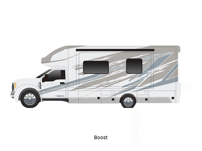 Sleeps 4 Slides 1 Length 30 ft 5 in Ext Width 8 ft 3 in Ext Height 12 ft 1 in Int Height 6 ft 10 in Interior Color Augusta, Bellport, Wilmington Exterior Color Optional Full Body Paint; Boost, Camber, Redline, Trail Boss, Polaris, Tundra, Atlas LR, Mojave Hitch Weight 12000 lbs GVWR 19500 lbs Fresh Water Capacity 75 gals Grey Water Capacity 44 gals Black Water Capacity 44 gals Furnace BTU 35000 btu Generator 8kW Onan Quiet Diesel Fuel Type Diesel Engine 6.7L Power Stroke V8 Turbo Diesel B20 Chassis F-550 Horsepower 330 hp Fuel Capacity 66.5 gals Number Of Bunks 1 Available Beds Murphy Torque 825 ft-lb Refrigerator Type 12V Compressor Refrigerator Size 10 cu ft Convection Cooking Yes Cooktop Burners 2 Number of Awnings 1 LP Tank Capacity 20 gals Water Heater Type Truma Comfort Tankless AC BTU 15000 btu TV Info LR 42" Smart LED TV, Entry 32" Smart LED TV, Ext. 27" LED TV Awning Info Lateral Arm Electric w/LED Lights Shower Type Standard Electrical Service 50 amp Similar Floorplans