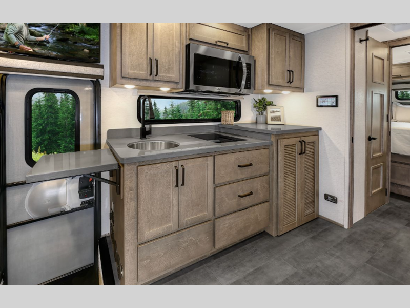 Step inside to find beautiful solid surface countertops, premium one-piece vinyl flooring throughout, solid wood cabinets, and more luxury features. You can fit all of your gear in the composite liner storage compartments relax under the lateral arm electric awning with LED lights, and use the see-level® tank monitoring system to monitor your units tank levels. You will also appreciate the 8" LCD touch screen infotainment center to make the drive that much easier, plus all of your power needs will be met with the 8kW Onan quiet diesel generator, one 400AH lithium battery, and a 3,000 True Sine wave inverter!