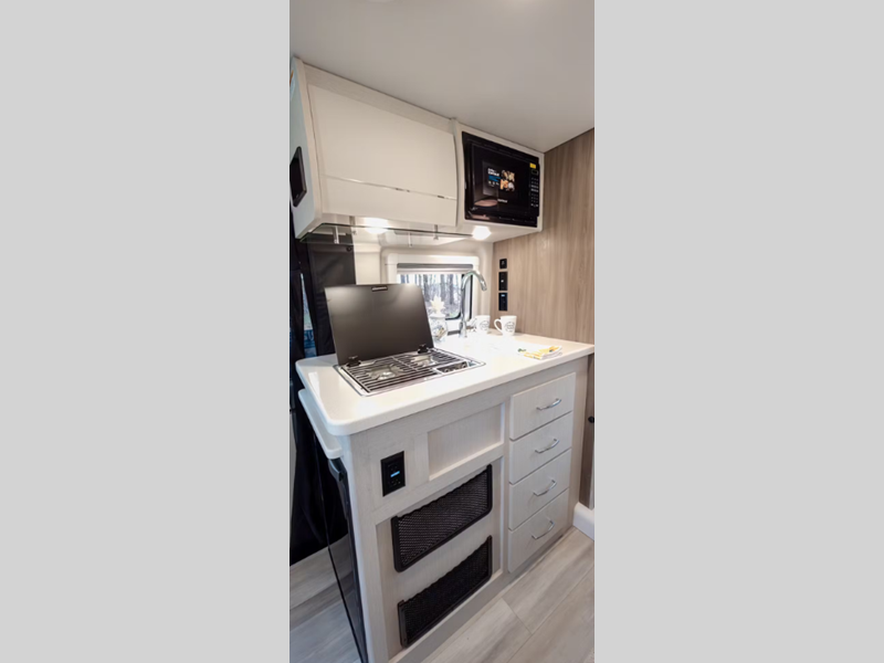 The Rize cockpit is any driver's dream with its touchscreen dash radio with Apple Carplay and Android Auto, leatherette swivel seats, and a back-up camera for hassle-free parking. Bench-style seating quickly converts into sleeping space at night, and there are fully equipped kitchens to enjoy home cooked meals each day. Each model includes a 2800 gas generator, a solar port connection in driver side and two house batteries that will allow you to go off-grid.